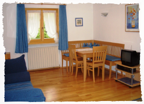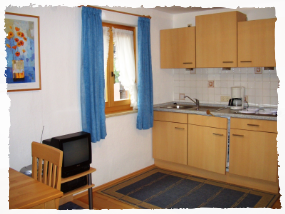 Das Appartement verfügt über eione große Wohnküche mit Eckbank und Ausziehcouch, einem Schlafzimmer mit